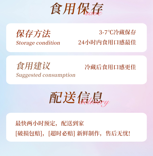 提供慢必赔服务保障,同城生日蛋糕商品订单若晚到1小时,此单无条件退款,此蛋糕免费赠送。(恶劣天气等外部不可控因素导致配送延迟情形除外)